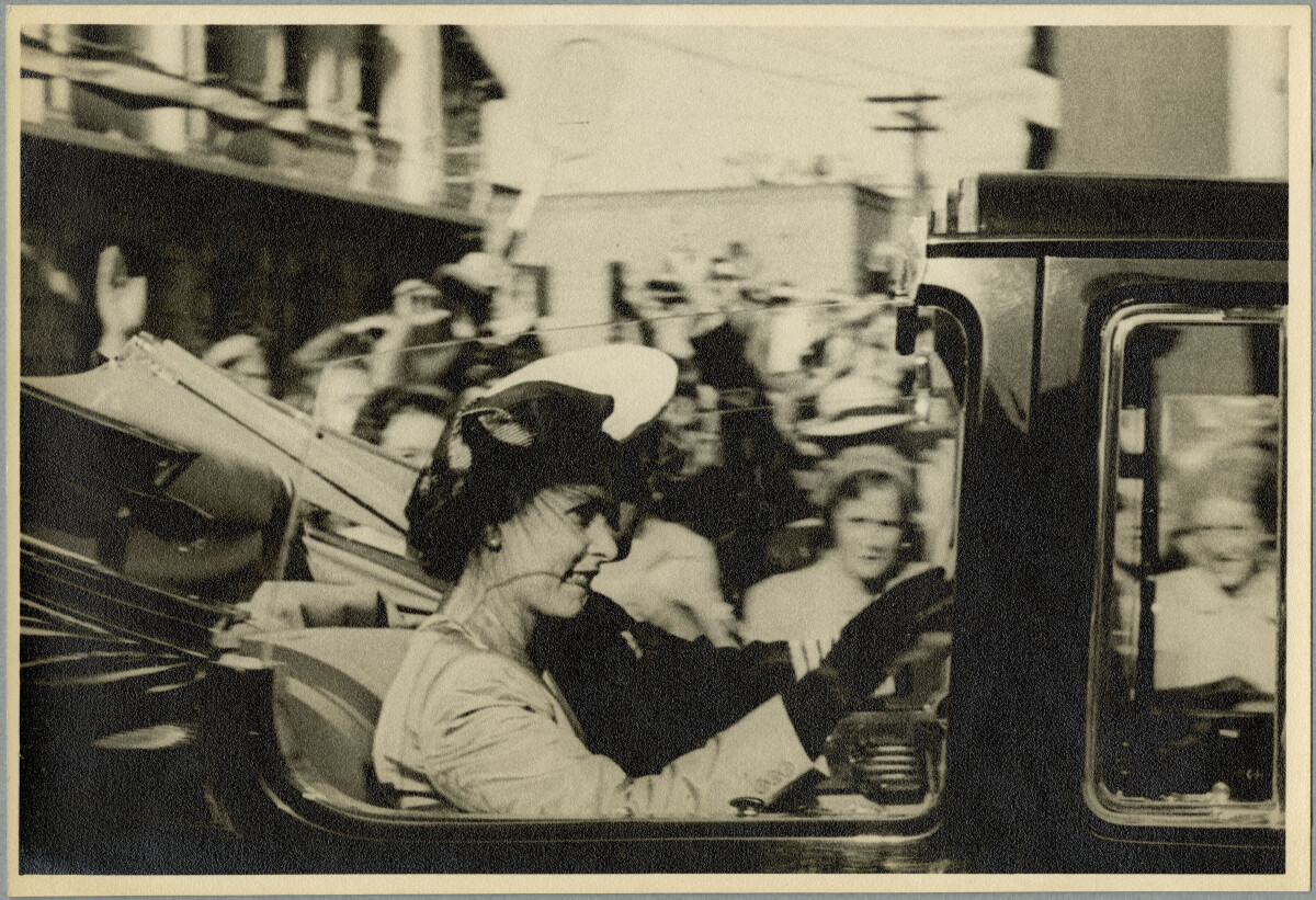 Photographs taken by my late father Pete Basire by the first visit of a Reigning British Monarch, Queen Elizabeth II and the Duke of Edinburgh, to New Zealand, Christchurch 18 -22 January 1954. Photo taken of the Royal couple, greeting the crowds, on route to one of their many official engagements.