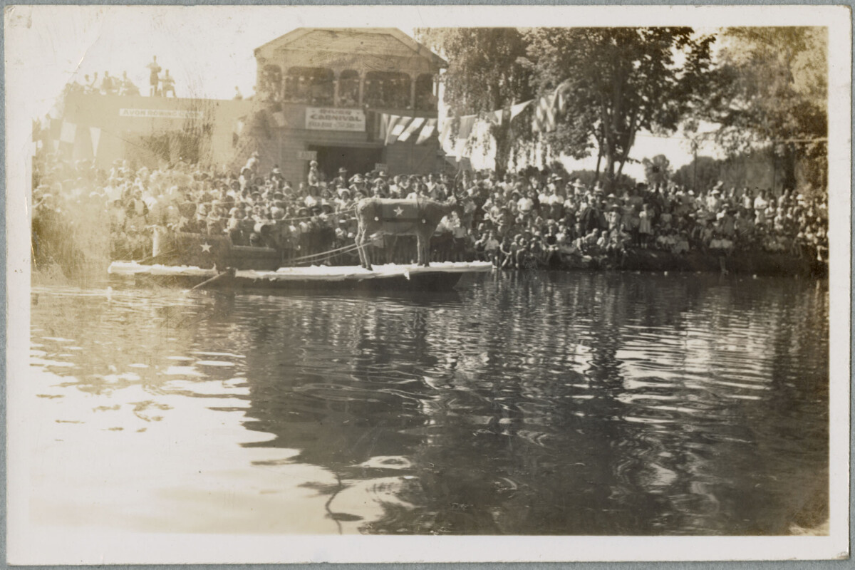 People watching Santa Claus during a Christmas river carnival on the Avon River, by the Avon Rowing Club.