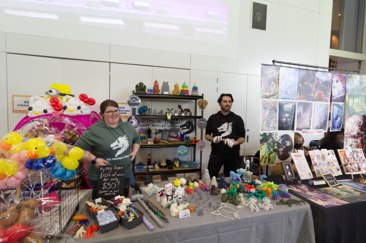 Jordan and Chris man the stall of The Printable Dragon at Kōwhai Fan Fest 2022, with a variety of 3D printed goods on sale.