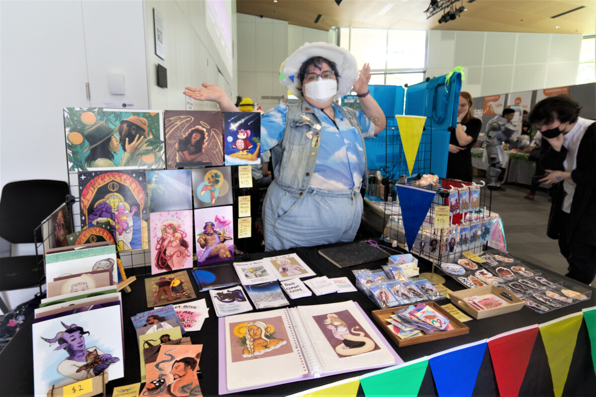 Prints stickers zines. By Alis. IG: @artemyiss. Stall at Kōwhai Fan Fest 2022.