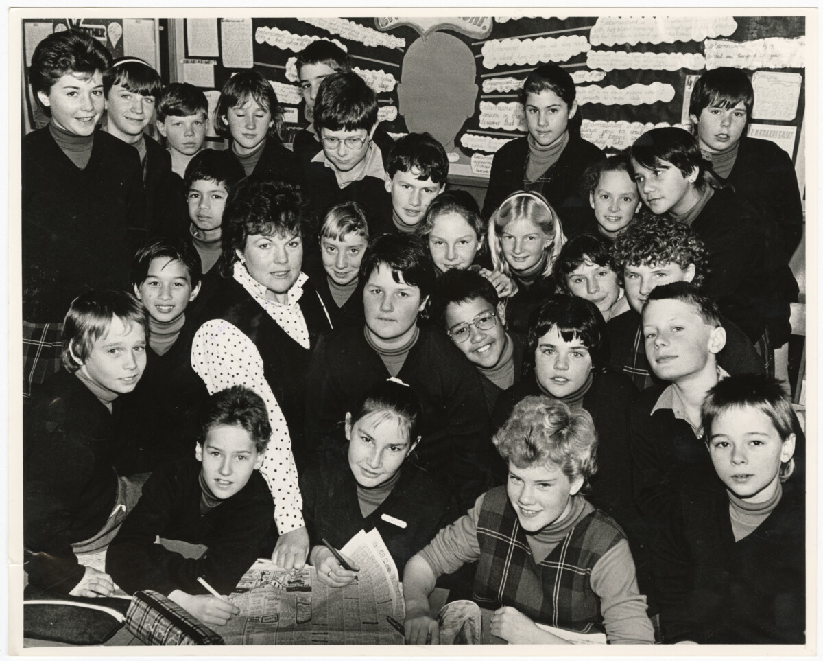 Teacher Mrs Tric Andersen with her class at Kirkwood Intermediate School looking over a newspaper.