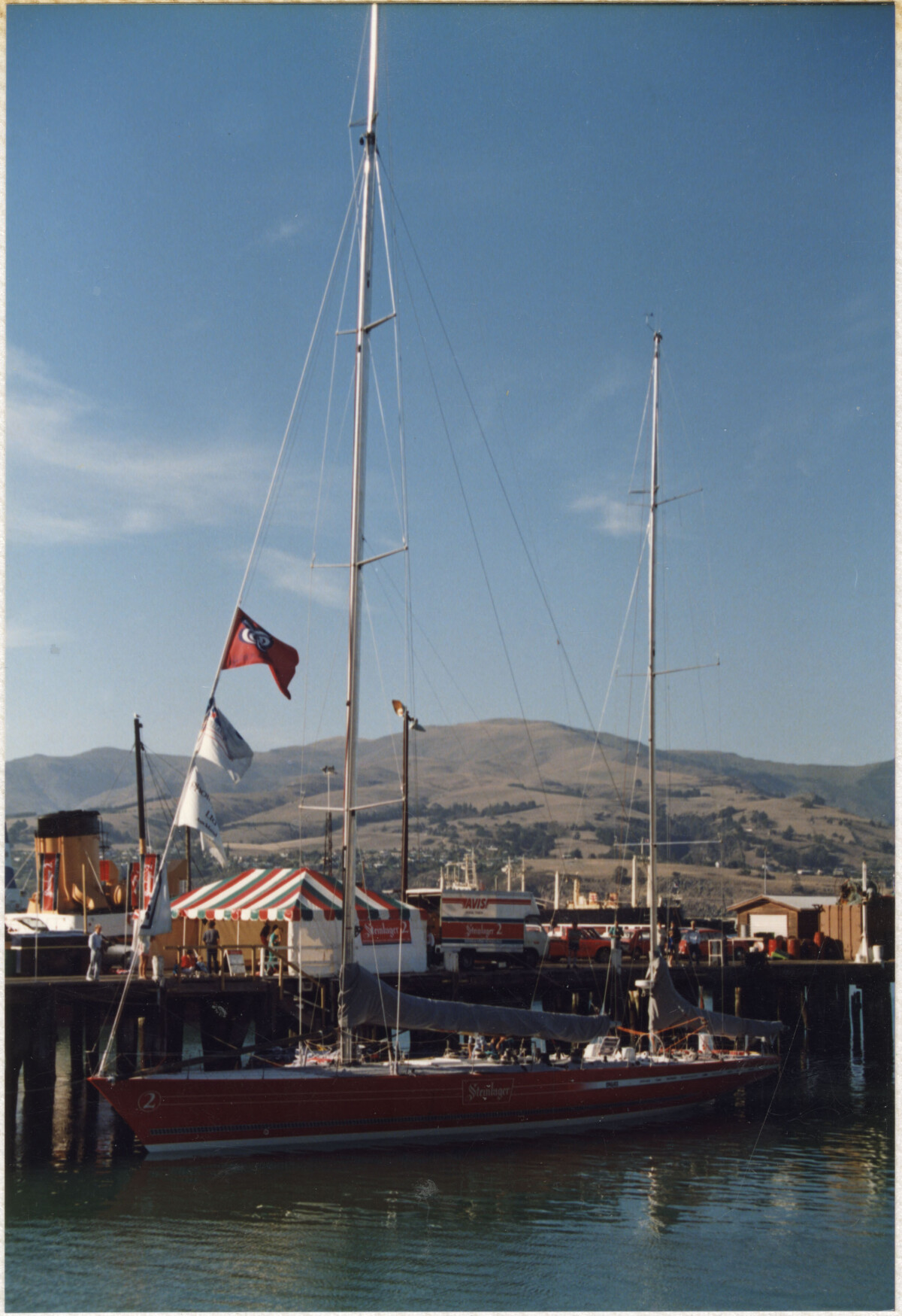 Lyttelton wharf with the T.E.V Māori at berth and cars waiting ...