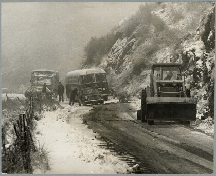 A grader clearing the snow on Dyers Pass Road with cars and ...