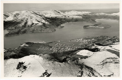 Snow on the Port Hills and Banks Peninsula. Lyttelton Harbour is ...