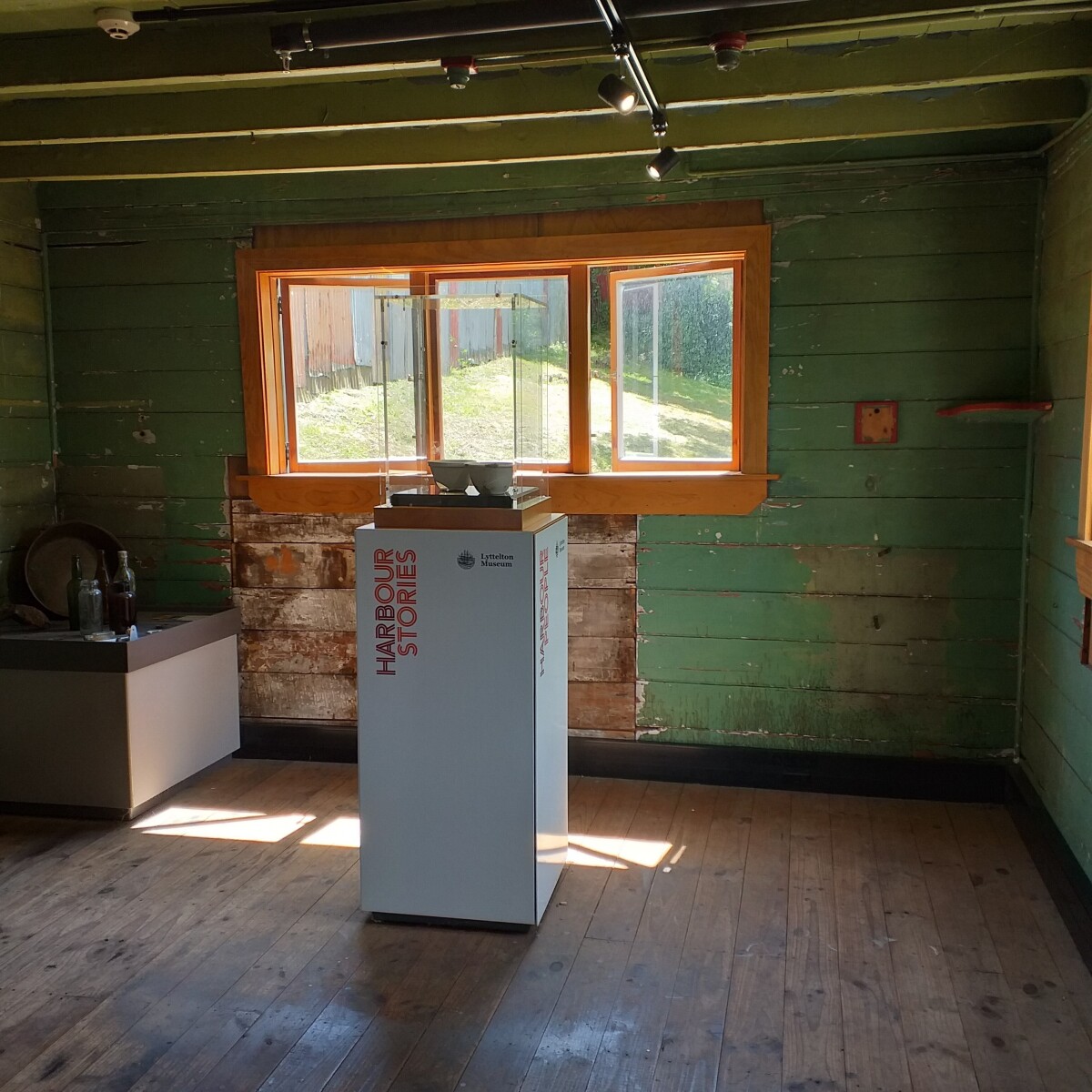 View from inside one of the rooms at Grubb Cottage, 62 London Street in Lyttelton. In the centre is a display from Lyttelton Museum.