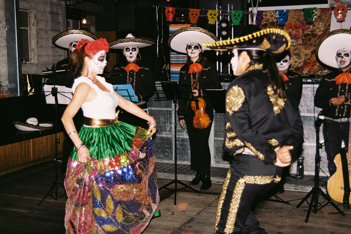 Two dancers celebrating Día de Muertos exhilaratingly move to the beat. One does not work without the other, the audience is completely mesmerised.