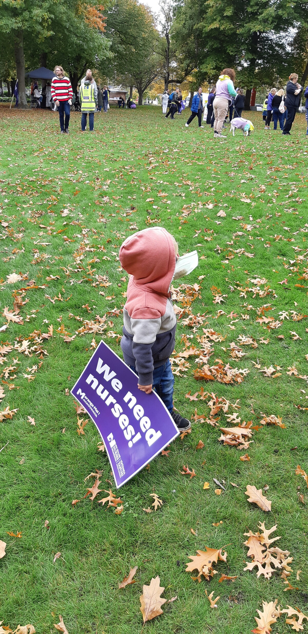 A toddler with a sign 'We need nurses!', supporting his dad at a New Zealand Nurses Organisation rally in Victoria Square following a protest march from the Bridge of Remembrance. The protest was to raise awareness of staff shortages, pay disputes including pay equity and other working condition grievances felt by the nursing community.