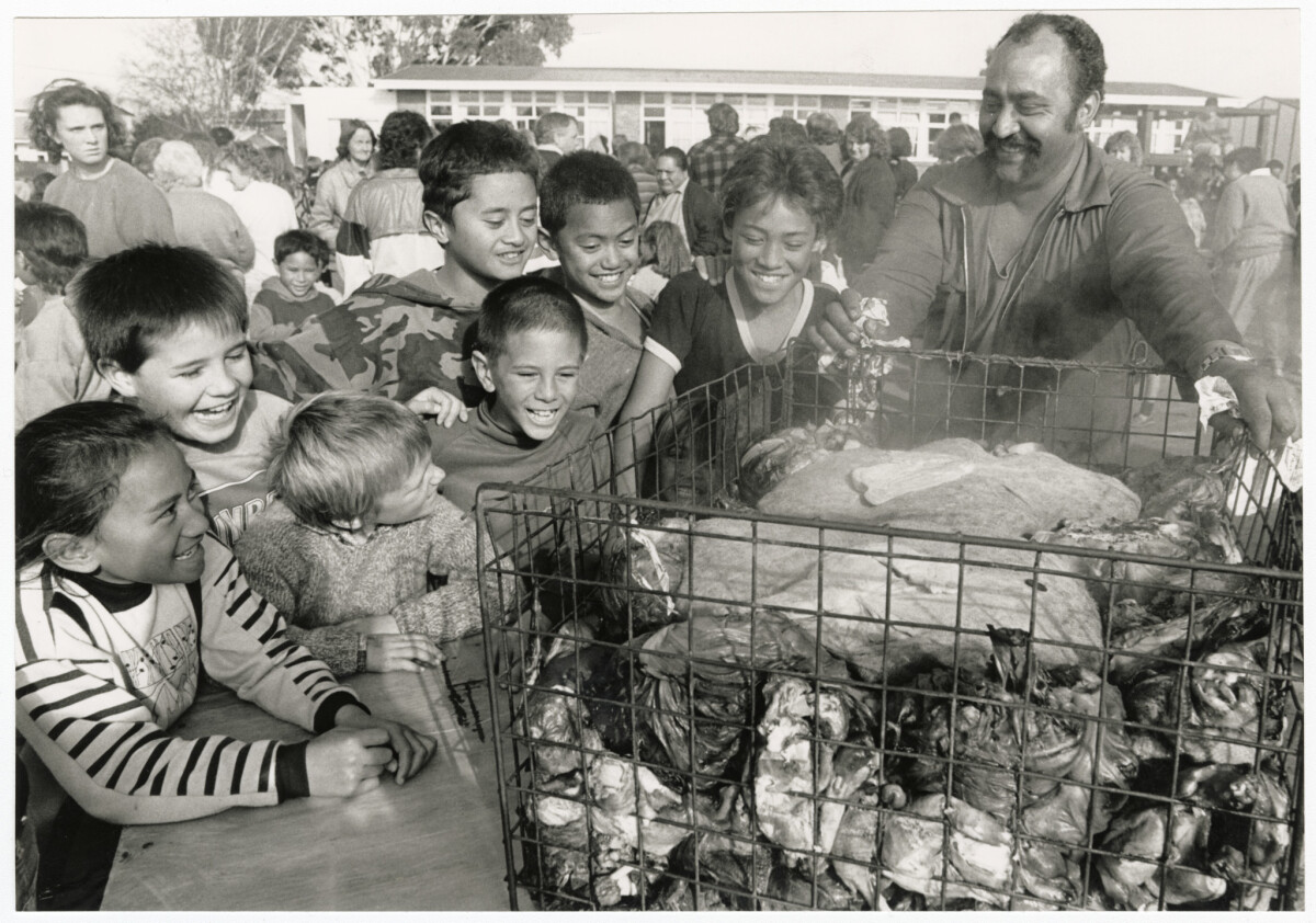 A group of children at Wainoni School gathered around a hāngi basket of cabbage attended by Ronald Amai. Children are, back from left, Nathan Cowan, Chris Manawatu, Joseph Kapea and Arthur Shelford. Front, from left, Choyce Maere, Damian Wise and Michael Tobia.