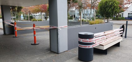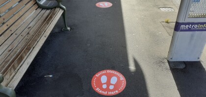 Social Distancing sticker outside Westpac bank, by bus stop ...