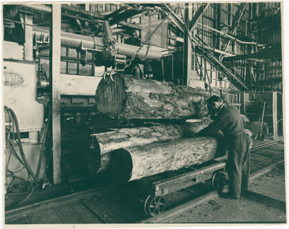 Preparation of logs for veneering at Fletchers Mandeville Street ...