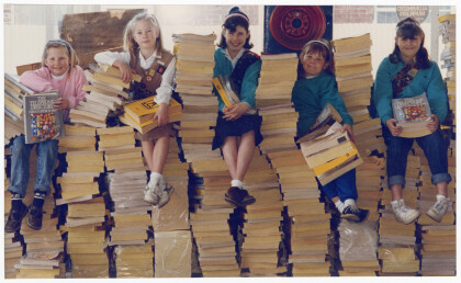 Riccarton Girl Guides and Brownies with stacks of telephone ...