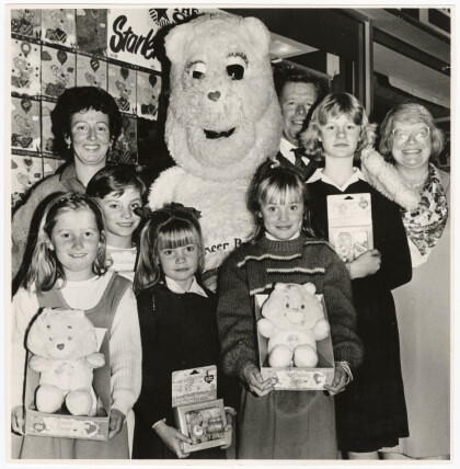 Cheer Bear with children holding Care Bear toys which they won ...