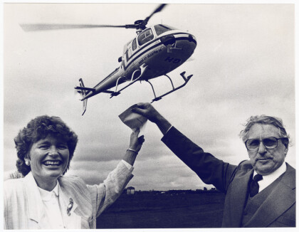 Vicki Buck and Keith Drayton with a rescue helicopter