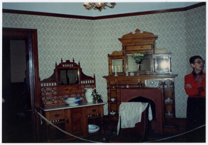 Interior fireplace with tea set and display of historic ...