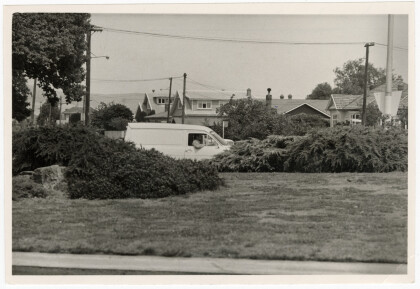 A bus obscured by bushes at the Deans Avenue-Riccarton Road ...