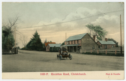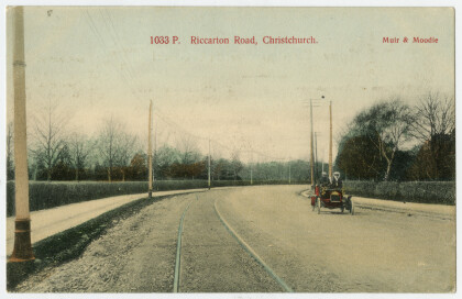 Coloured New Zealand postcard no. 1035 P showing Riccarton Road, ...