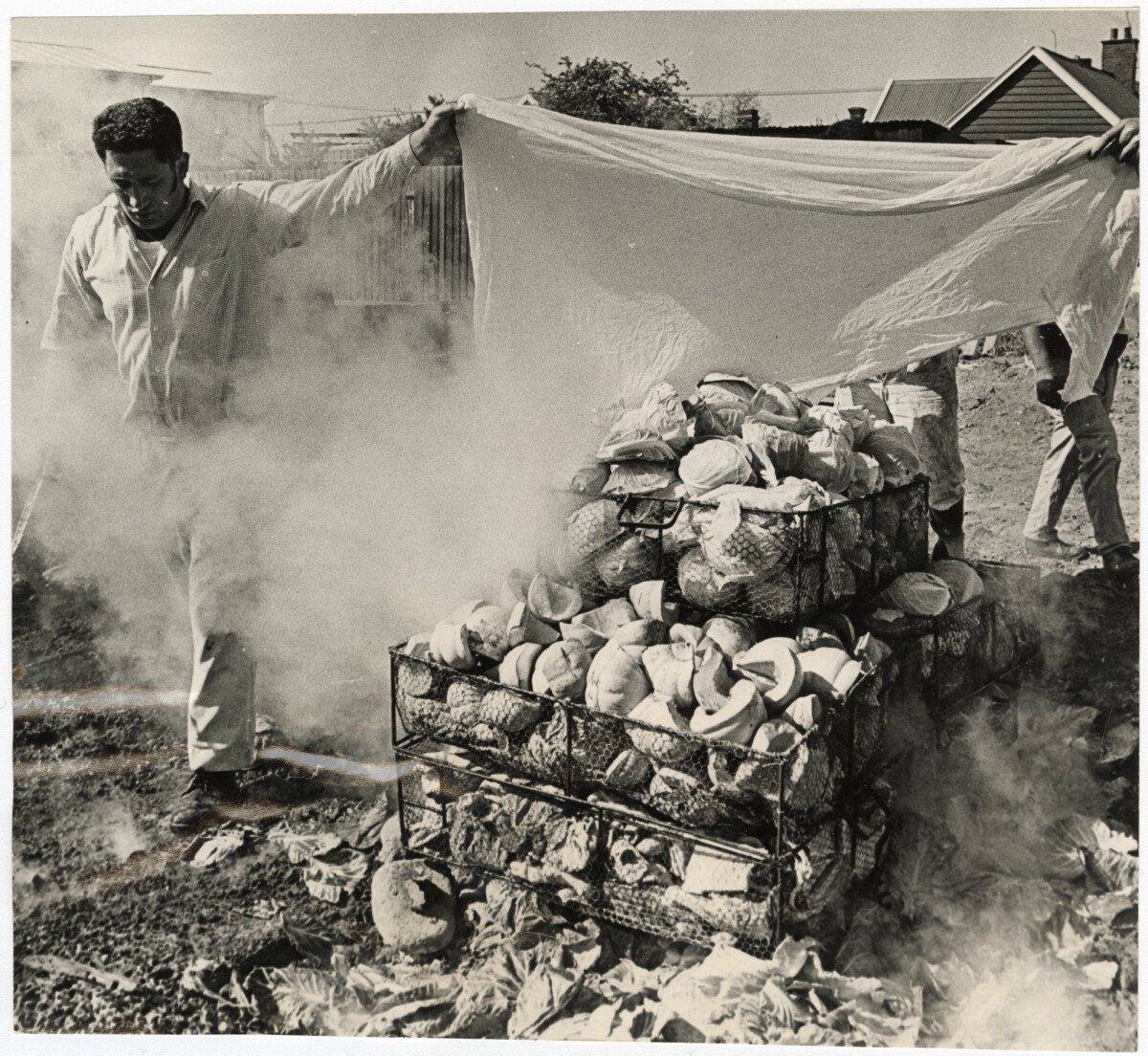 Baskets of cabbages and pumpkins for a hāngi being prepared for attendees of the Māori Boys' Hostel annual fair.