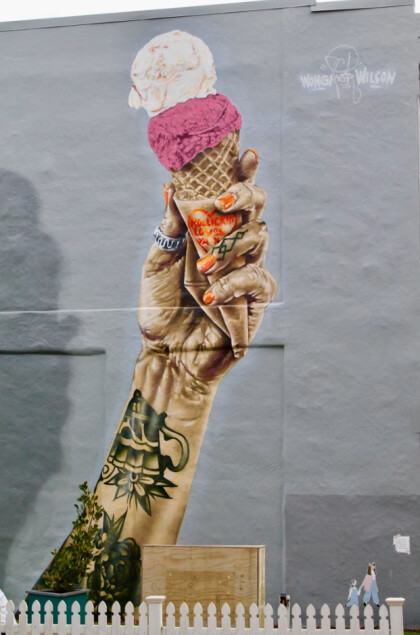 Wongi Wilson works on a mural on the side of Rollicking Gelato, ...