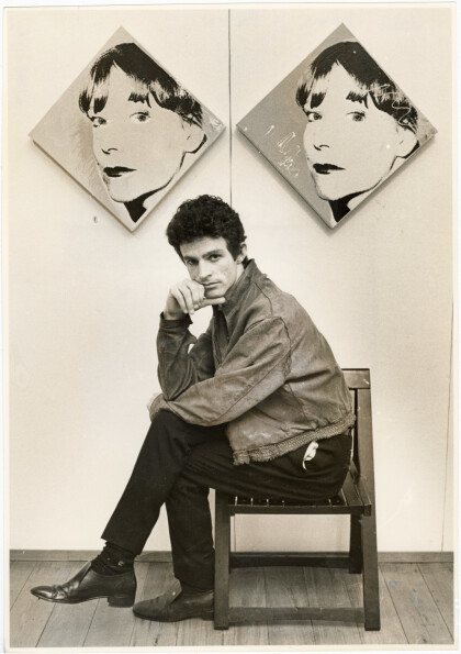 Paul Johns, artist, posing in front of his portraits of ...