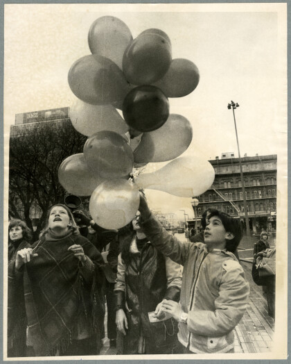 People releasing balloons for Hiroshima Day in Cathedral Square.