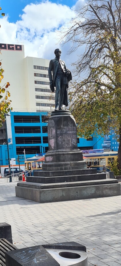 Chalked slogans on the Godley Statue in Cathedral Square. ...
