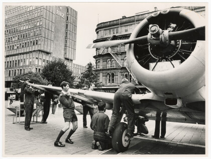 An RNZAF Harvard, NZ1083, is being assembled in Cathedral Square ...