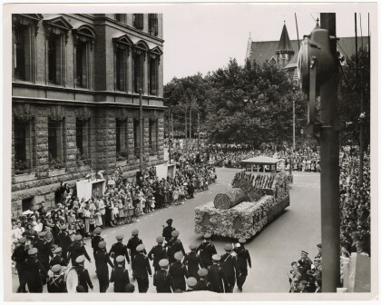 View through crowds waving at Queen Elizabeth II on the balcony ...
