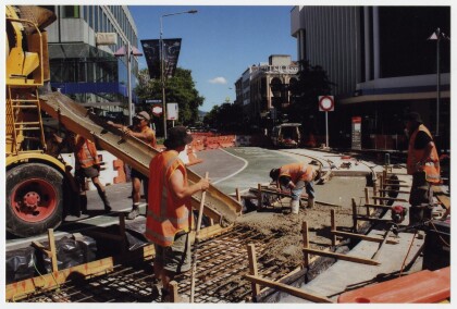 Tramway extension in Cathedral Square. Note the ANZ/BNZ/TSB bank ...