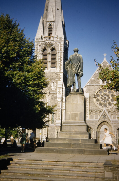 Rear view of the Robert Godley statue in Cathedral Square with ...