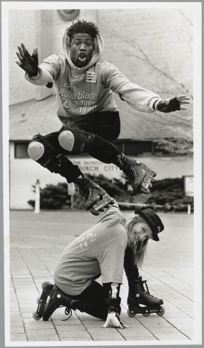 Bruce Action Jackson jumping Jill Shulz on rollerblades.
