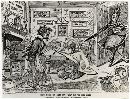Cartoon depicts a woman who has received the vote wanting her ...