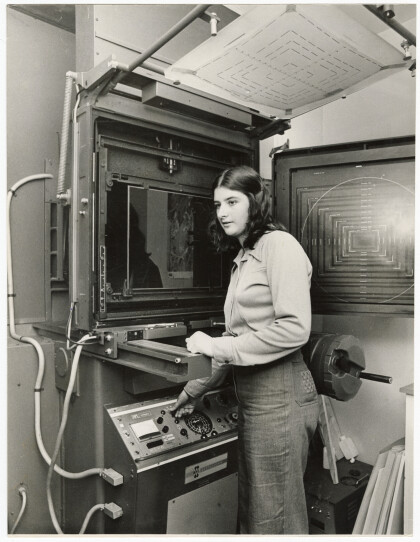 Elizabeth O'Callaghan, photo engraving apprentice, standing with ...