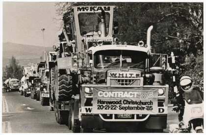 Procession of trucks and trailers advertising Contract '85