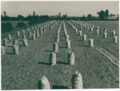 View across a field with sacks filled with onions in rows.