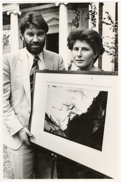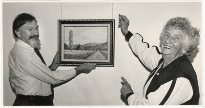 Emily Cosgrove watches as John Coley hangs her painting