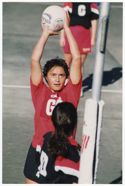 Gameplay action of goal shooter Sonia Butler of Sacred Hearts ...