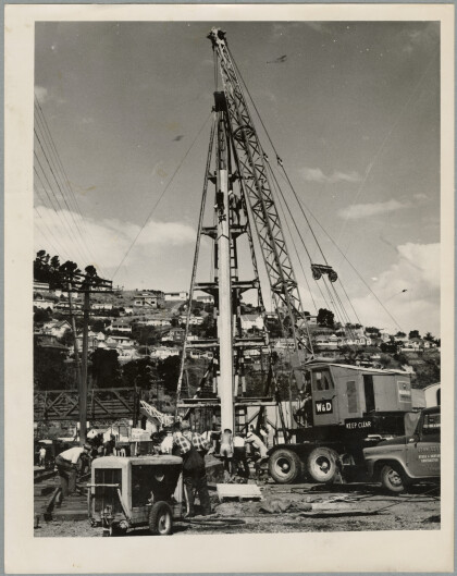 Concrete pile being driven at the No.2 wharf, Lyttelton, in ...