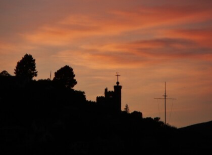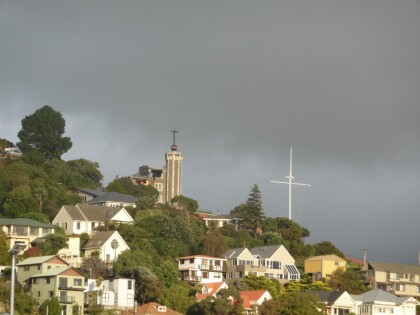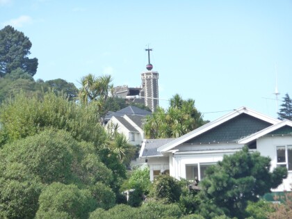 Sugarloaf tower and building on the Port Hills above Christchurch.
