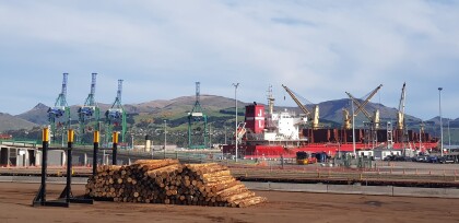 View of logs at Lyttelton Harbour with a large container ship ...