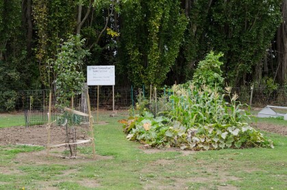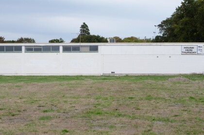 View of grass and a wall with a sign 'Housie here Thursday' on ...