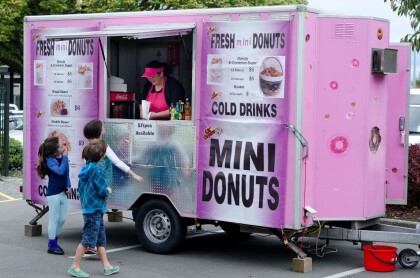 Three children at a mini donut food truck at Halswell Market ...