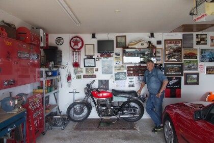 Chris standing next to his motorbike in his garage at his house ...