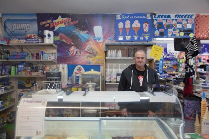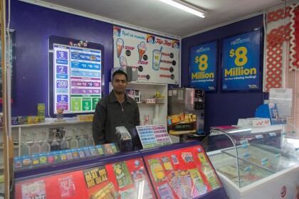 View of dairy worker, Gaurang, stood behind the till in Halswell ...