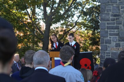 Two students in uniform speaking at the Anzac Day service at 322 ...