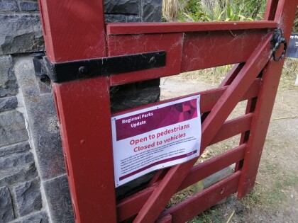 Corona virus warning on the gate at Halswell Quarry.