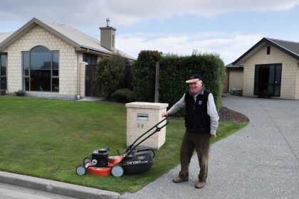 Roger mowing the lawn outside his house on Stallion Avenue in ...