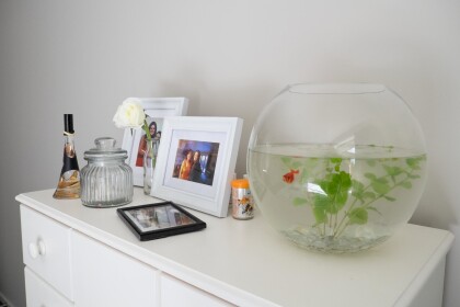 Close-up of Abby's bedroom dresser with photographs and a pet ...