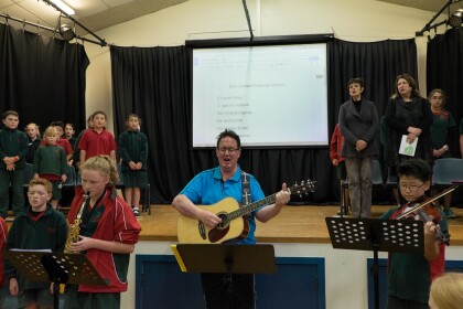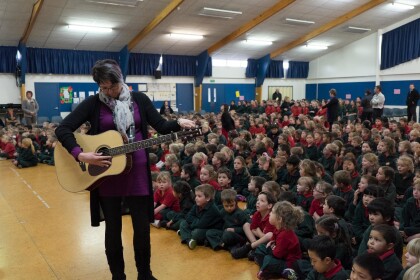 Stacey, an Oaklands Primary School teacher, tunes her guitar ...
