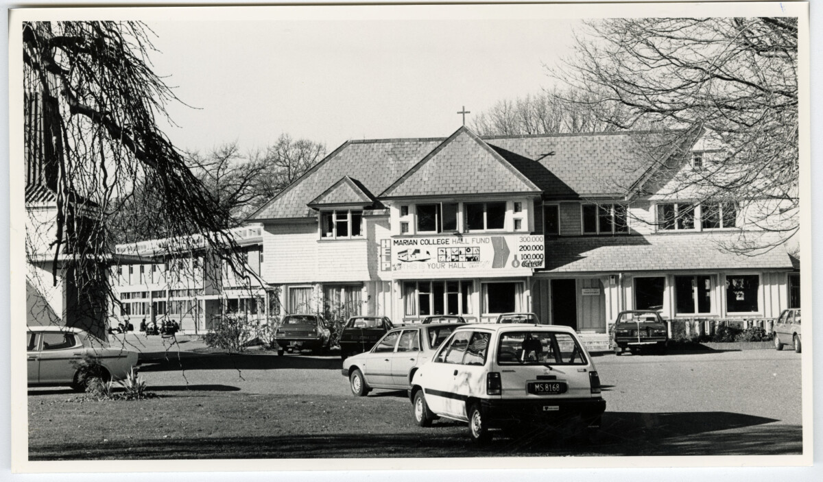Exterior view of the main building at Marian College, Shirley. Cars are parked outside the main entrance and a banner for the Marian College hall fund is attached above the main entrance.
