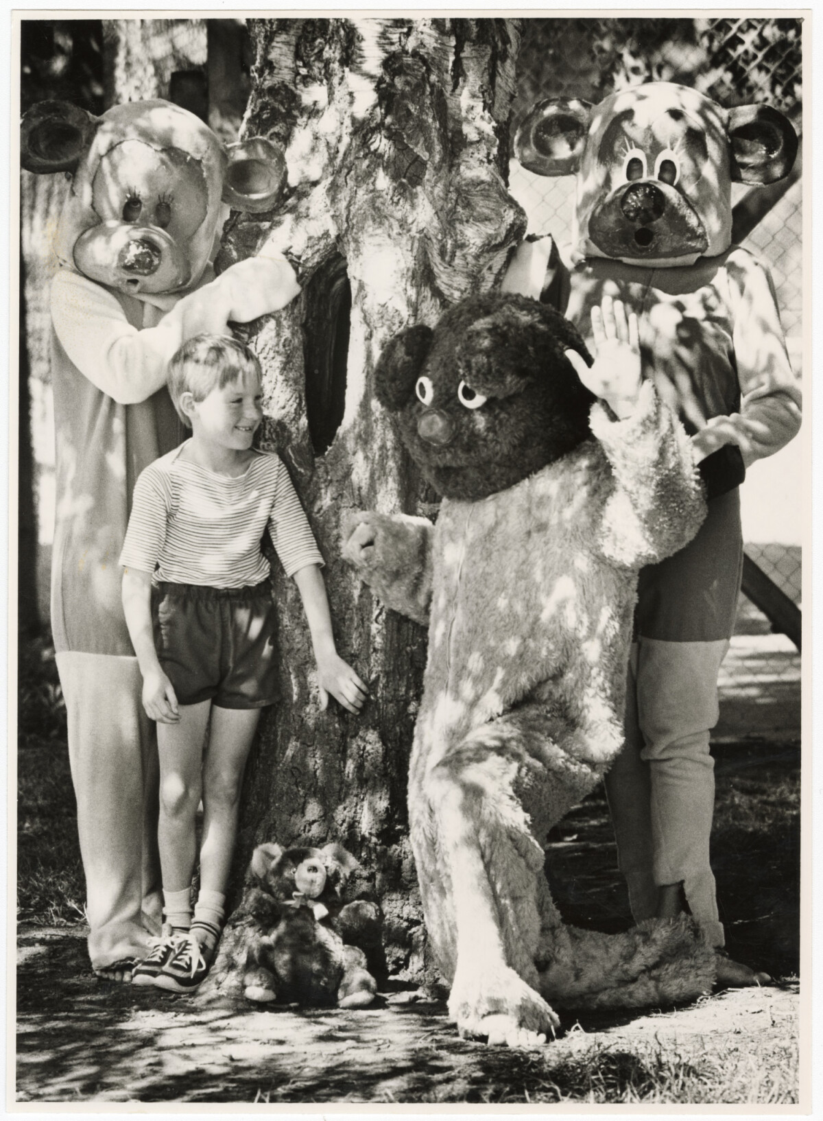 Samuel Hart with three individuals in teddy bear costumes.